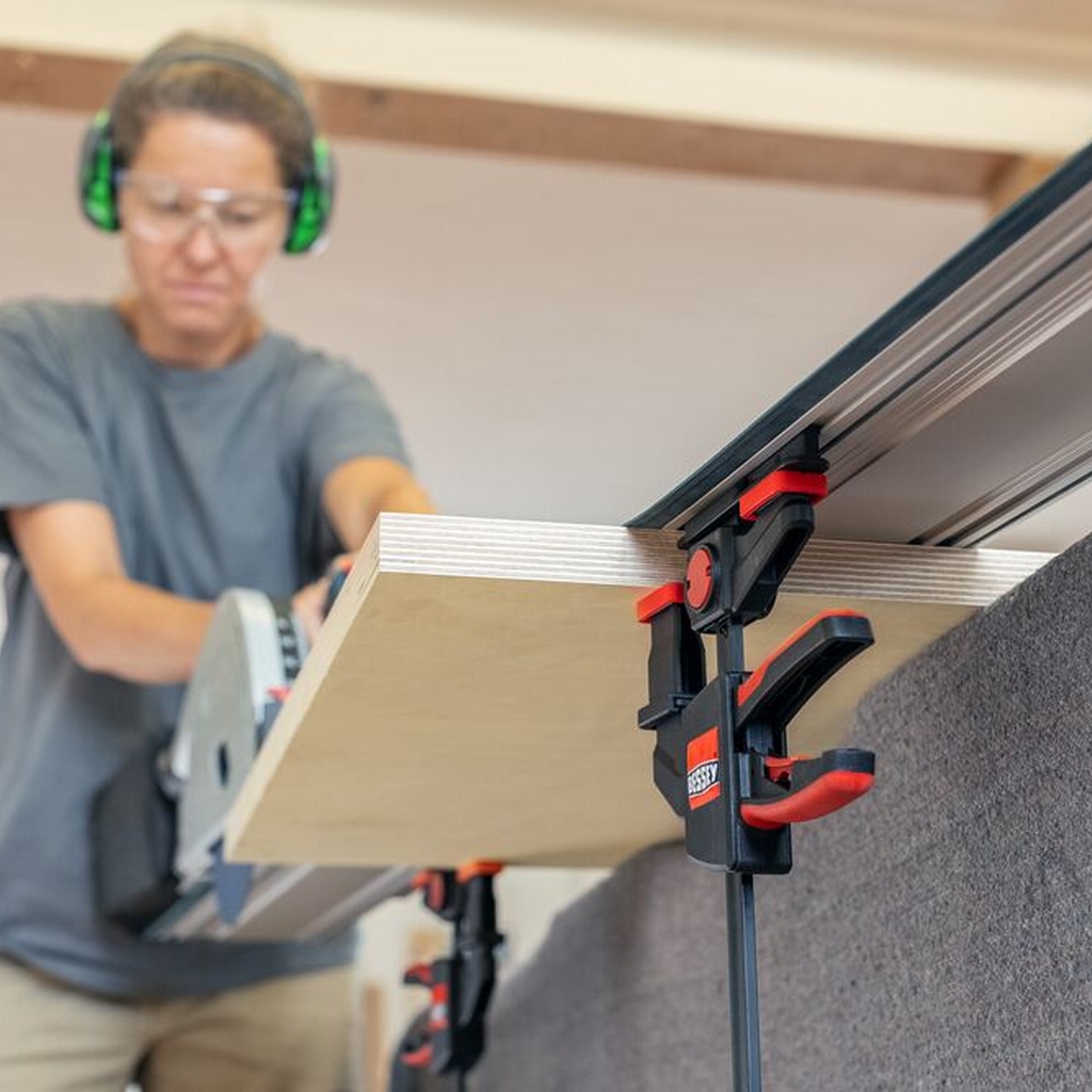 • mit Adapter auf Unterteil und umgedrehtem Oberteil zum sicheren Fixieren von Führungsschienen der Marken Festool, Protool, Metabo, Makita, Hitachi/Hikoki, Dewalt etc. und zum Spannen in Profilen sowie auf Arbeitstischen mit Adapter auf Ober- oder Unterteil zum übergreifenden Spannen mit oder ohne Adapter zum Spannen oder Spreizen