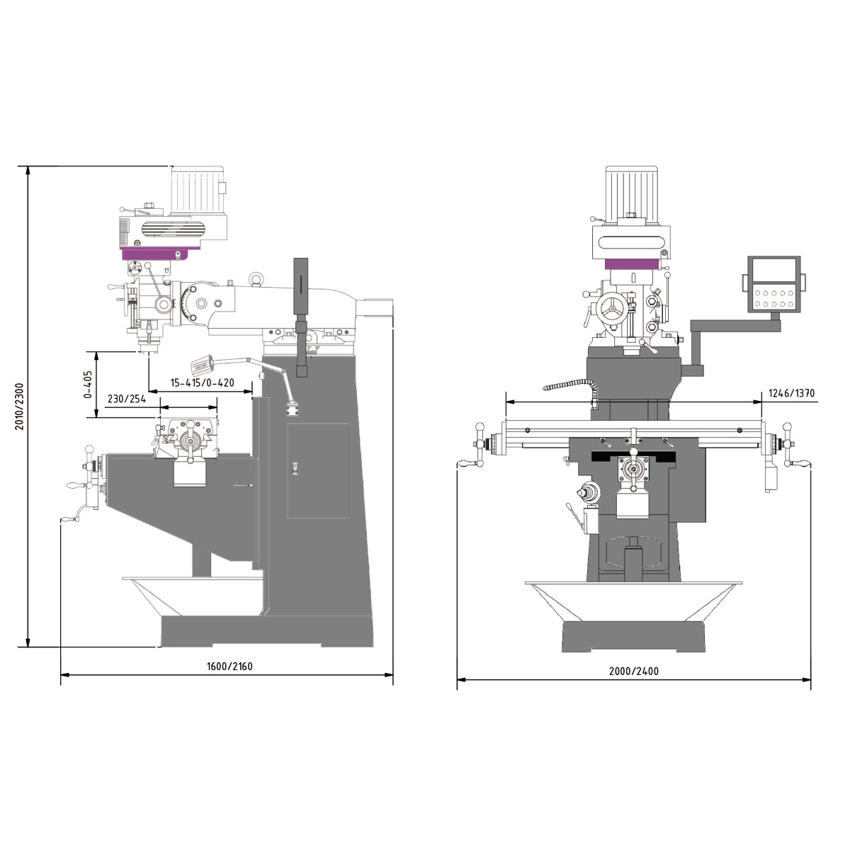 Massive Ausführung aus hochwertigem Meehanite-Guss Hohe Rundlaufgenauigkeit durch Kegelrollenlager, = 0,01 mm in der Pinole gemessen X- und Z-Achse mit nachstellbarer 55° Schwalbenschwanzführung Y-Achse mit nachstellbare Flachführung Kühlmitteleinrichtung Massiver und groß dimensionierter Kreuztisch, präzise oberflächenbearbeitet mit einstellbaren Endanschlägen Bohr-Fräskopf neigbar ± 45° Automatischer Pinolenvorschub, 3-stufig 0,04 - 0,15 mm/U Präzisions-Mikrovorschub Einstellbarer Bohrtiefenanschlag mit Millimeterskala, frontseitig ablesbar Rechts-/Linkslauf Stufenlose Geschwindigkeitsregelung Frässpindel mit Präzisionslager Mechanische Spindelbremse Höhenverstellbare Schutzscheibe mit Mikroschalter, gegen umherfliegende Späne und Teile, für größtmöglichen Schutz des Anwenders