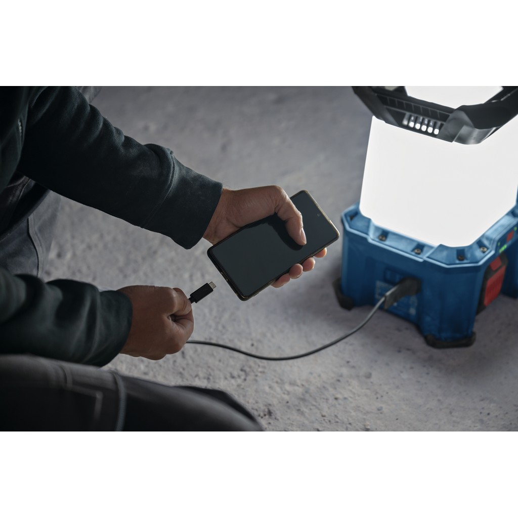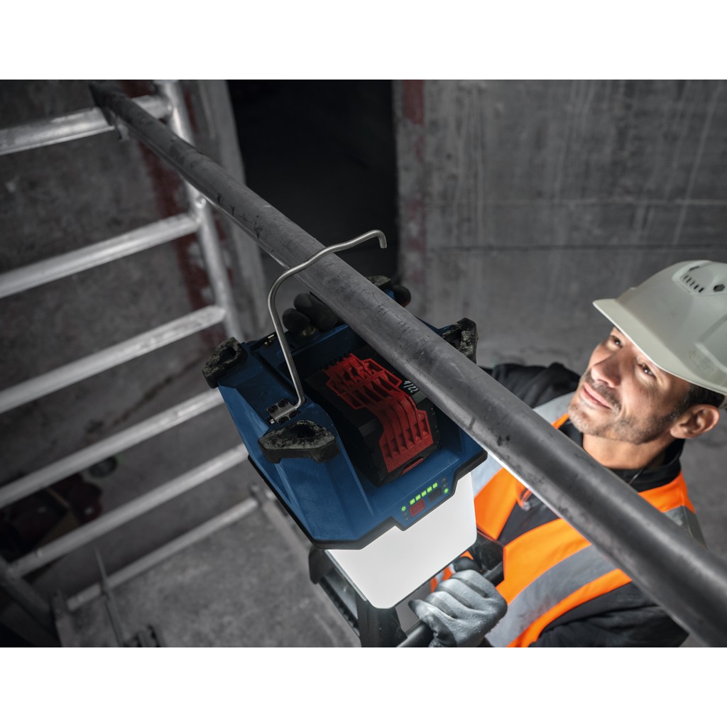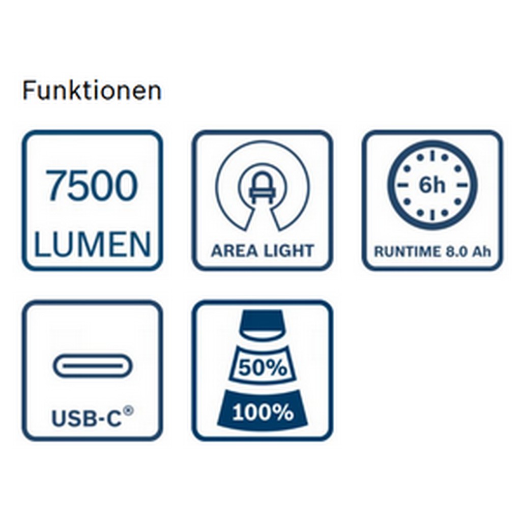 - Die Bauleuchte Bosch GLA 18VH-7500 Professional ist ein Hybridgerät für den Einsatz mit oder ohne Kabel. Die USB-C® Power Delivery funktioniert mit einer Leistung von bis zu 15 W. Ihre HMI-Funktion besitzt drei LED-Anzeigen für: Ein-/Dimmen-/Aus-Anzeige, 180°/360°-Funktion und Akkuladestand. Sie bietet zwei Montageoptionen: über einen Haken oder ein Stativ mit dem 5/8"-Gewinde zur Befestigung des Leuchtenstativs GLT 300-40.