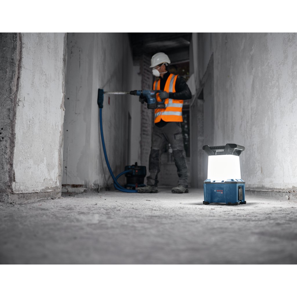 - Die Bauleuchte Bosch GLA 18VH-7500 Professional beleuchtet Arbeitsbereiche in Gebäuden, wo keine permanente Beleuchtung vorhanden ist. Sie ist ein Hybridgerät, das mit oder ohne Kabel betrieben werden kann.