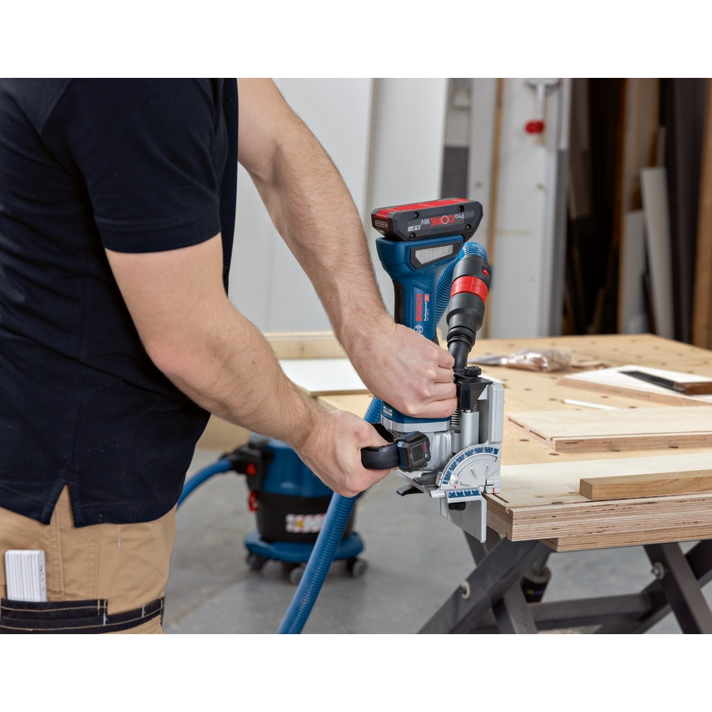 - Bei Verwendung einer kabelgebundenen Flachdübelfräse zum Fräsen von Schlitzen ist die Mobilität eingeschränkt. Das ist unpraktisch. Unsere kabelfreie GFF 18V-22 Professional mit Staubsack bietet nicht nur maximale Freiheit, sondern auch ausgezeichnete Präzision. Das Werkzeug erlaubt uneingeschränktes Bewegen rund um die Werkbank beim Verbinden von Holzwerkstücken. Dank der leichtgängigen Tauchfunktion, robusten Aluminium-Winkelanschlägen und zahlreichen Funktionen und Einstellmöglichkeiten kannst du auf hervorragende, professionelle Arbeitsergebnisse und hohen Komfort zählen. Frästiefe, -höhe und -winkel lassen sich einstellen, ohne dass ein zusätzliches Werkzeug hierfür erforderlich ist. Es gibt deutliche Markierungen für die Anzeige der waagerechten und senkrechten Schnittposition. Für Anwenderschutz und mehr Sauberkeit im Arbeitsbereich ist ein Absaugstutzen integriert, der für staubfreies Fräsen an den Staubsack oder einen Staubsauger angeschlossen werden kann – innerhalb des Bosch-Systems ist kein Adapter erforderlich.