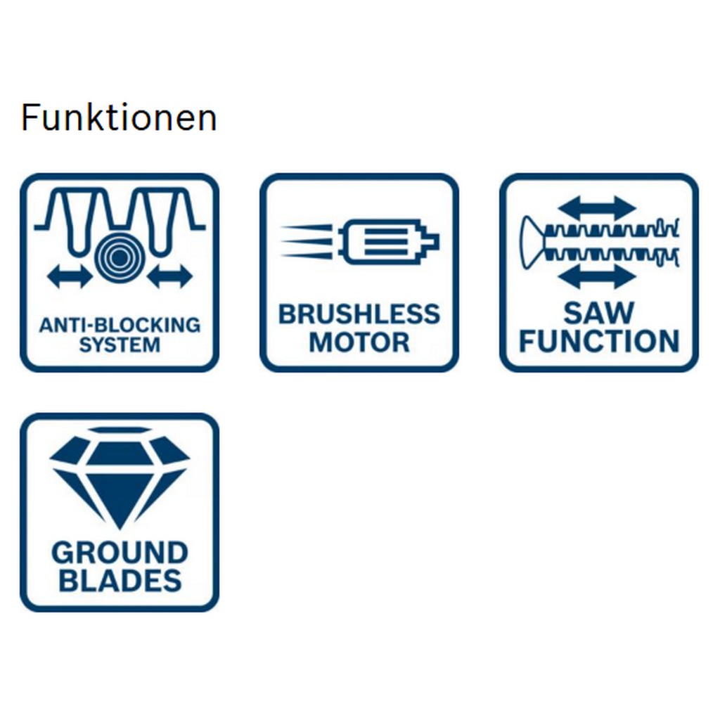 - Ihr 50 cm langes Messer schneidet dickere Äste ohne Verklemmen dank des patentierten Bosch Anti-Blocking Systems
