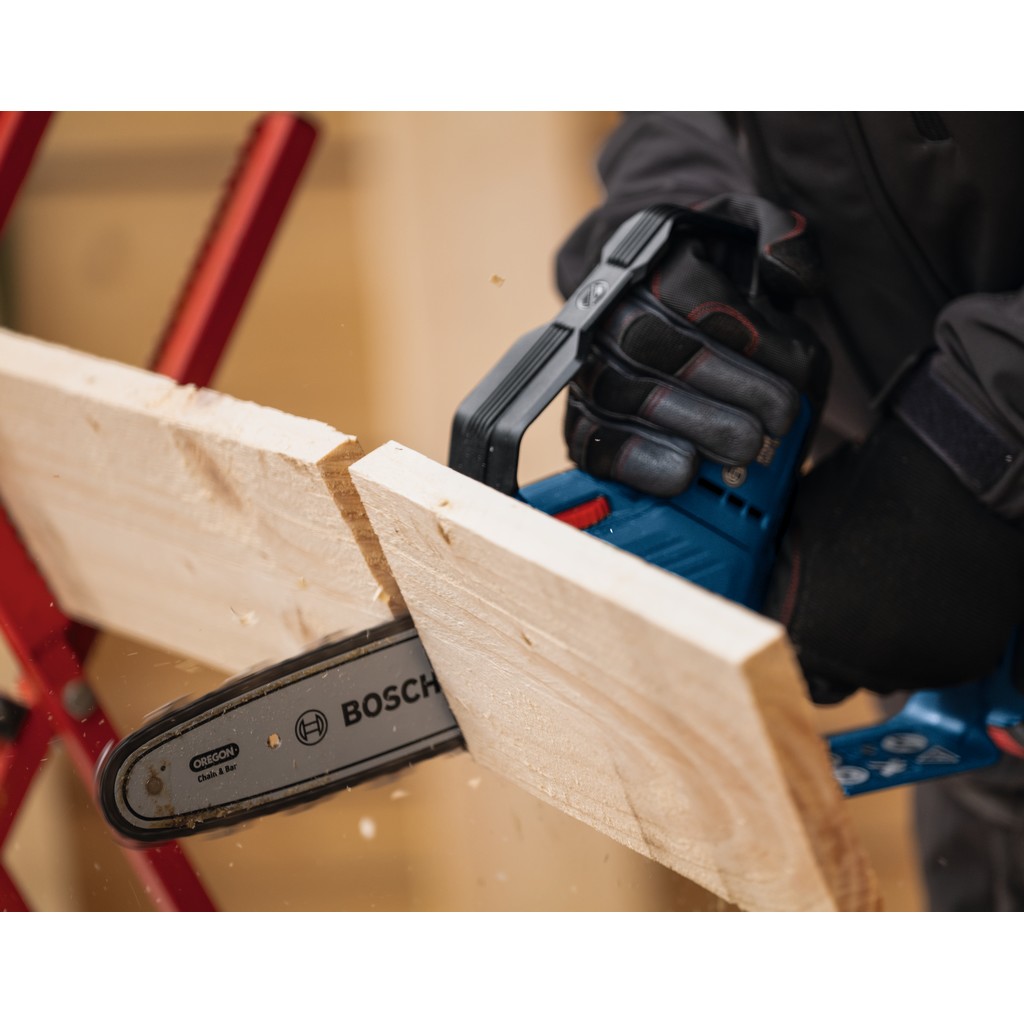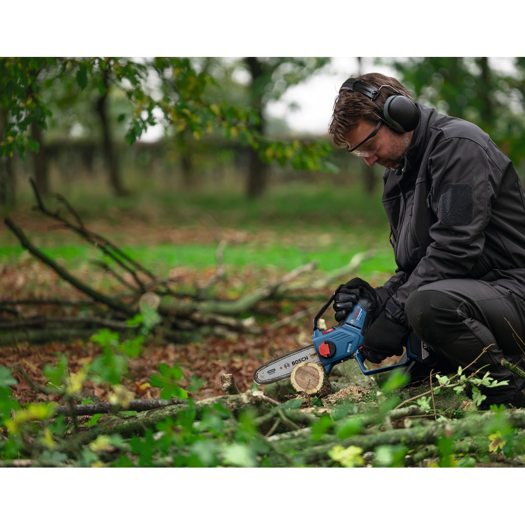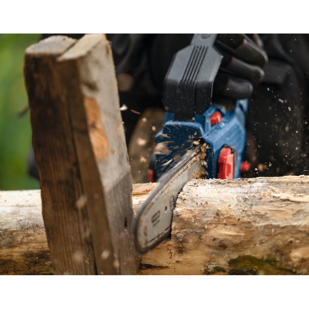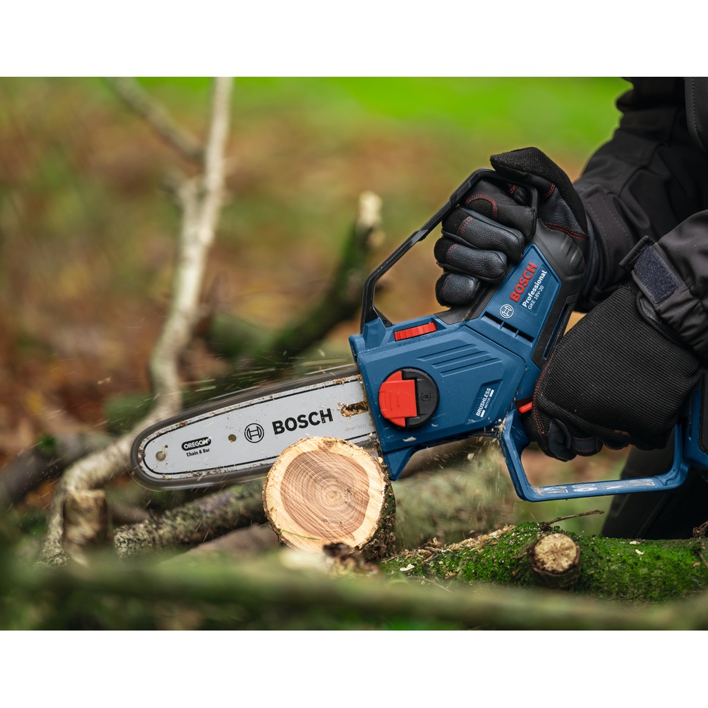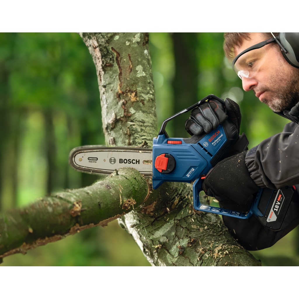 • Kettensägen können groß und unhandlich sein, besonders wenn auf engstem Raum auf der Baustelle und im Garten gearbeitet wird. Die Bosch GKE 18V-20 Professional Astsäge ist sowohl leicht als auch kompakt und eignet sich perfekt für Arbeiten an schwer zugänglichen Stellen. Der bürstenlose Motor liefert kraftvolle Leistung und sorgt für eine lange Lebensdauer. Das automatische Kettenschmiersystem verbessert die Leistung weiter, indem die Kette immer geschmiert bleibt. Diese Astsäge wurde auch mit Blick auf eine verbesserte Kontrolle entwickelt: Sie verfügt über einen Gyrosensor, der die Bewegung überwacht und die Kettenbremse auslöst, wenn ein potenzieller Rückschlag erkannt wird.