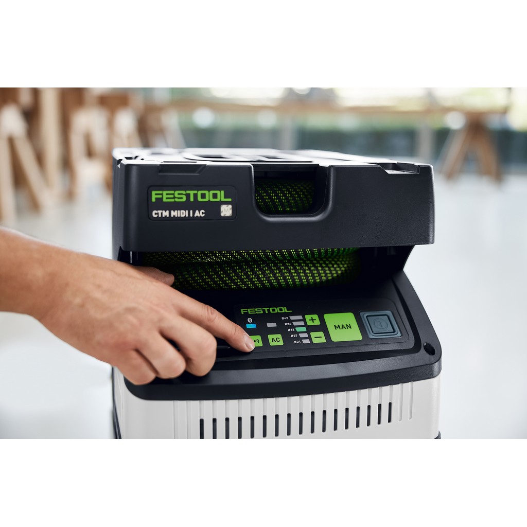 Geringes Gewicht, kompakte Maße und jede Menge innovativer Details – der Kompaktsauger CTM MIDI überzeugt rundum. Mit intuitiver Touch-Bedienung, glattem Saugschlauch und ebener Ablagefläche für Werkzeuge und Arbeitsmaterialien. Manuelle Abreinigung und Hauptfilterwechsel von außen für ausdauerndes, gesundheitsschonendes Arbeiten. Durch integrierte Bluetooth® Technologie startet das Absaugmobil über den Bluetooth® Akkupack oder die optionale Fernbedienung automatisch. Das innenliegende Schlauchdepot, die Systainer T-LOC Kopplung sowie die praktische Kabelaufwicklung sorgen für Ordnung und Tempo. Ideal und komfortabel für reine Luft bei Service- und Montagearbeiten.
