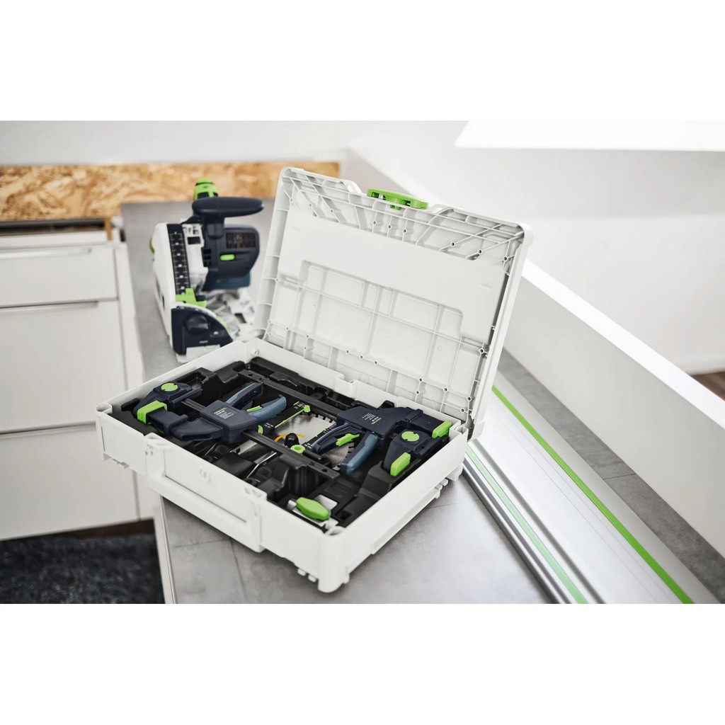 - Mit den passenden Einhandzwingen fixierst du deine Führungsschiene mit nur einem Handgriff am Werkstück, für sichereres und kontrolliertes arbeiten. Zusätzlich gibt es im Systainer auch noch Platz für deine Sägeblätter und die FS-Verbinder – so hast du dein Systemzubehör immer griffbereit.