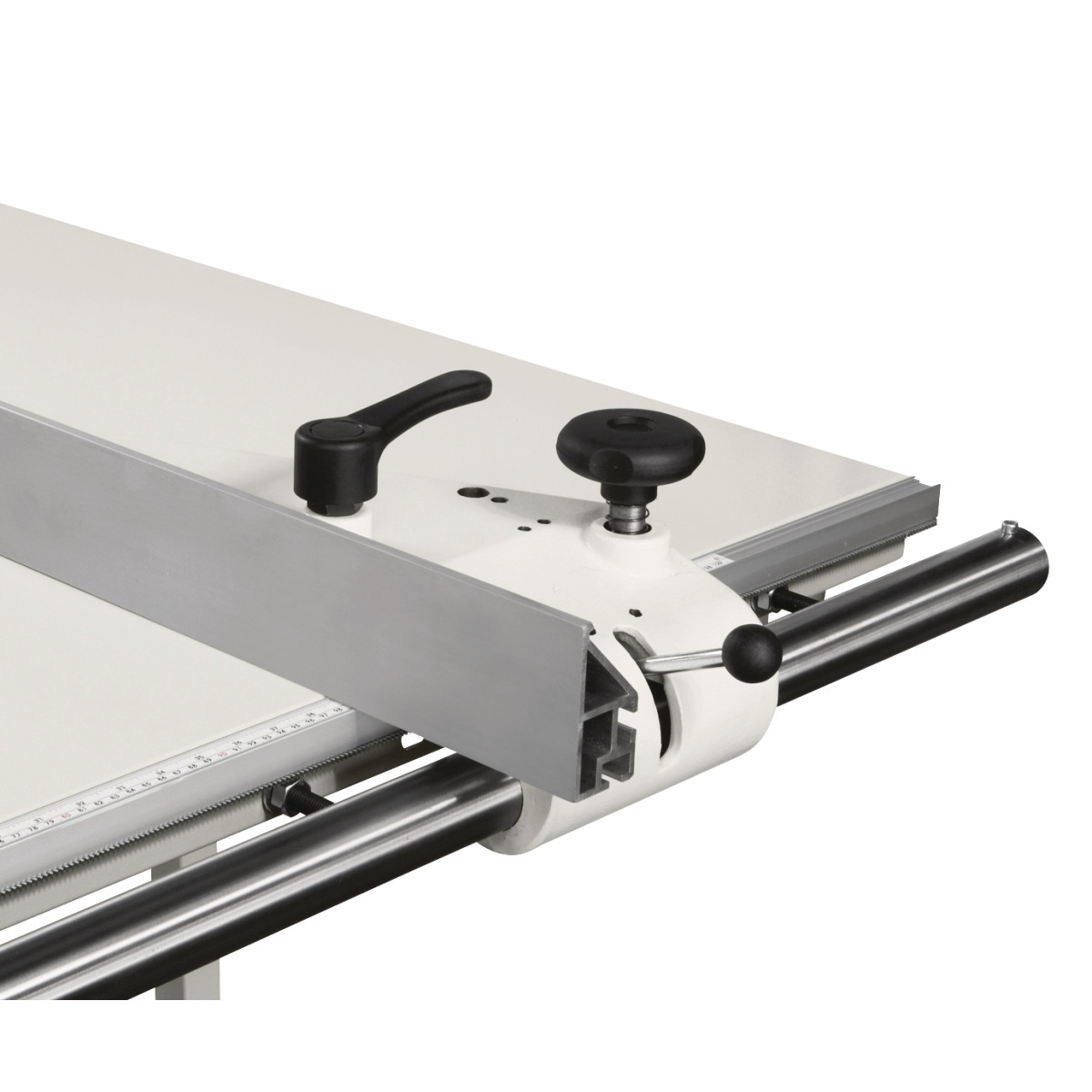 Massiver Arbeitstisch aus stark verripptem Grauguss – für maximale Stabilität und Langlebigkeit Robustes Untergestell aus geschweißtem Stahl – garantiert hohe Verwindungssteifigkeit und vibrationsfreies Arbeiten Präziser Formatschiebeschlitten aus eloxiertem Aluminium – leichtgängig geführt über hochwertiges Kugelkontaktsystem Hartmetall-Führungsbahnen – für dauerhafte Präzision und minimale Wartung Schwenkbares Grauguss-Sägeaggregat mit doppelter Segmentführung – exakte Null-Punkt-Schwenkung für höchste Schnittgenauigkeit Massiver Parallelanschlag mit Rundstangenführung Ausgestattet mit verschiebbarer Exzenterspannvorrichtung Integrierte Winkelschnittvorrichtung am Schiebeschlitten – für schnelle und präzise Gehrungsschnitte