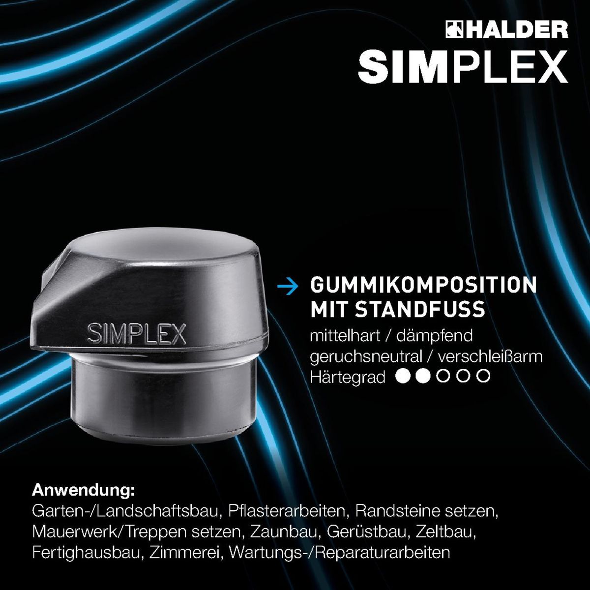 - Der SIMPLEX-Schonhammer D60mm (Art. 3027.260) mit der Einsatzkombination Gummikomposition / Superplastik ist der Topseller aus dem Hause Halder. Der Gummi-Einsatz mit Standfuß sorgt mit genialer Formgebung für einen sicheren Kopfstand des Hammers und weniger bücken was die Arbeit wesentlich ergonomischer und rückenschonender gestaltet. Die bewährte Gummi-Mischung ist sehr verschleißarm, dämpfend und geruchsneutral und hält um ein Vielfaches länger als ein herkömmlicher Gummi-Hammer. Der Superplastik-Einsatz ermöglicht eine höhere Schlagkraft als der Gummi-Einsatz. Alle Teile sind austauschbar / nachrüstbar, somit sehr wirtschaftlich und umweltfreundlich.
