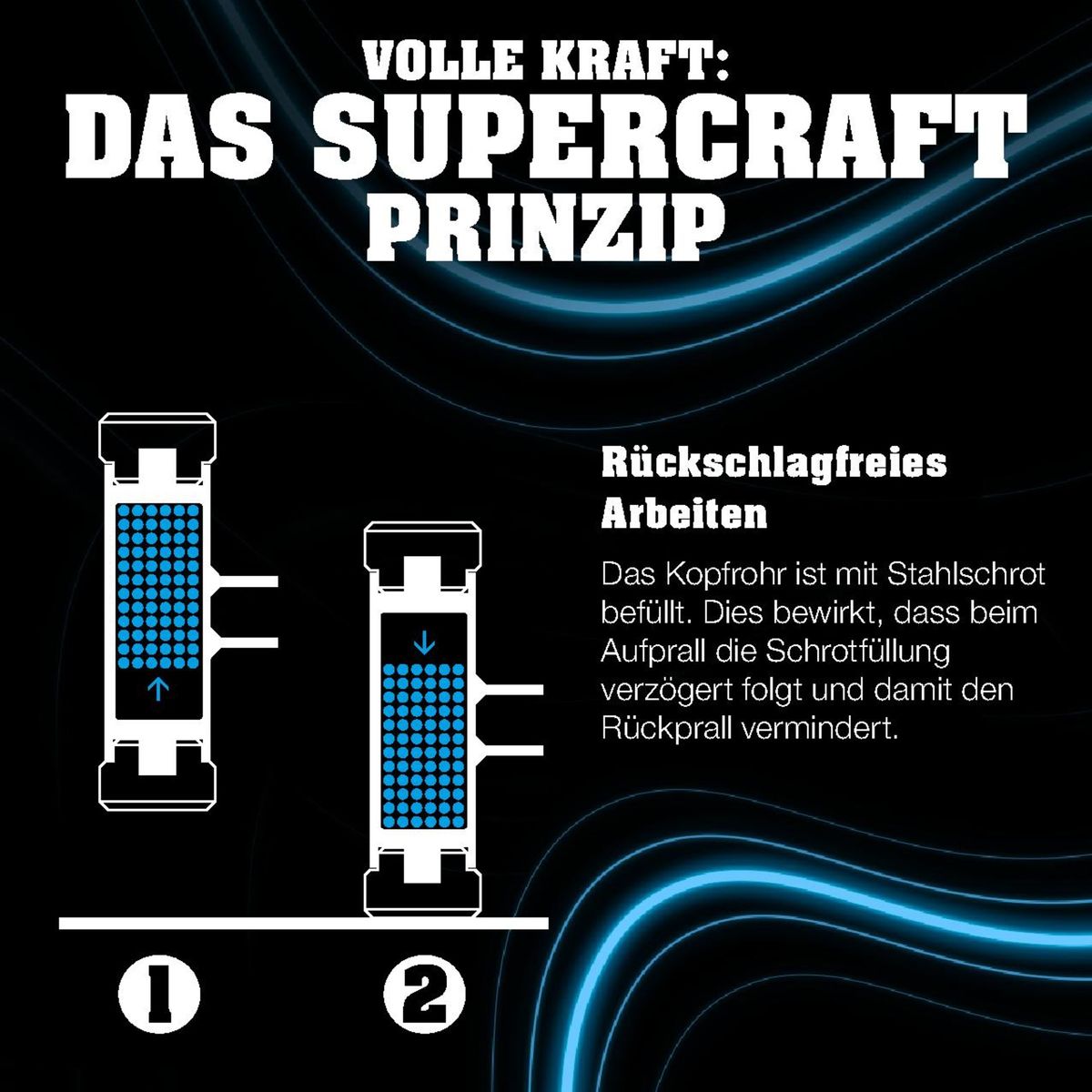 Das Kopfrohr der SUPERCRAFT-Hämmer ist mit Stahlschrot befüllt. Dies bewirkt, dass beim Aufprall der Schlagfläche auf das Werkstück die Schrotfüllung verzögert folgt. Durch den verminderten Rückprall wird die Schlagenergie optimal ausgenutzt. Dadurch sind sehr kraftvolle Schläge möglich. Darüber hinaus ist die Arbeit mit SUPERCRAFT-Hämmern deutlich gelenkschonender und geräuschärmer als mit gewöhnlichen Stahlhämmern.