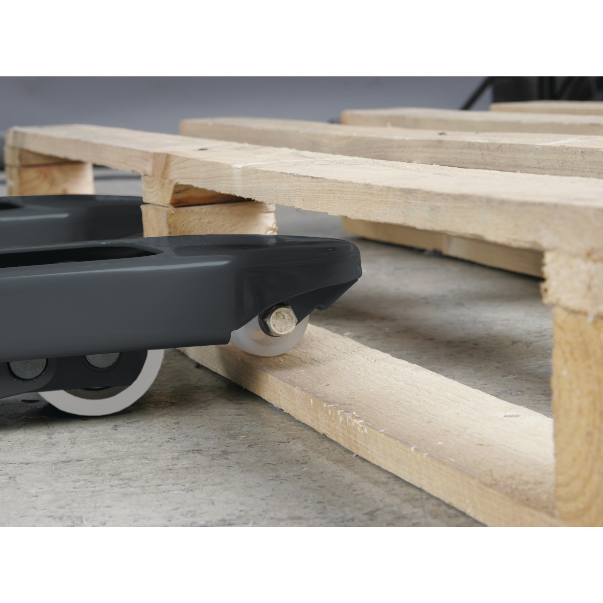 Heben, Senken und Neutralposition über Einhandhebel bedienbar Serienmäßig mit einem Fußablasshebel, der das flexible Absenken der geladenen Paletten mit dem Fuß ermöglicht Leichtgängige Hydraulikpumpe mit hartverchromtem Kolben und Überdruckventil Absenkgeschwindigkeit über feinfühliges Ablassventil stufenlos einstellbar Leichtes Verfahren auch von schweren Lasten dank Nylon-Lenkrollen und Single Gabelrollen aus Nylon Robuste Kugellager in allen Rädern und Rollen Stahlrahmen und Gabel in sehr stabiler und verwindungssteifer Schalenbauweise Einlaufrollen für das leichte Einfahren in Paletten Ergonomisch geformte Deichsel