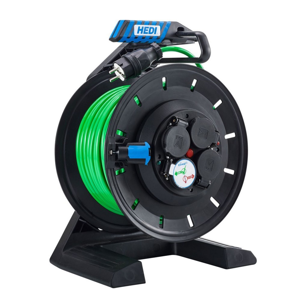 • Bestückt ist diese Kabeltrommel mit 40 m HEDI Panzerkabel Plus H07BQ-F 3G1,5 in grün (RAL 5015) mit Schutzkontakt-Stecker, einer spritzwassergeschützten 4-fach Schutzkontakt-Steckdose 250 V, mit Dichtungslippe und selbstschließenden Klappdeckeln, Schutzart IP54, dem HEDI Diagnosesystem DiagS sowie einem Thermoschutzschalter