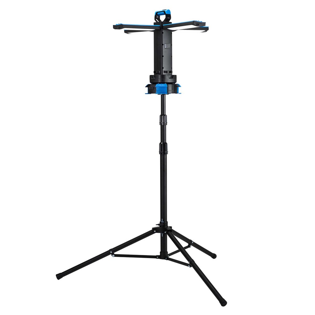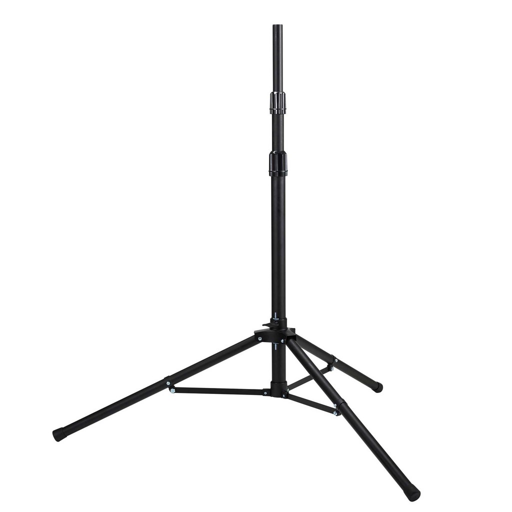 • Das stabile, schwarze Stativ aus Aluminium ist stufenlos höhenverstellbar bis zu einer maximalen Höhe von zwei Metern