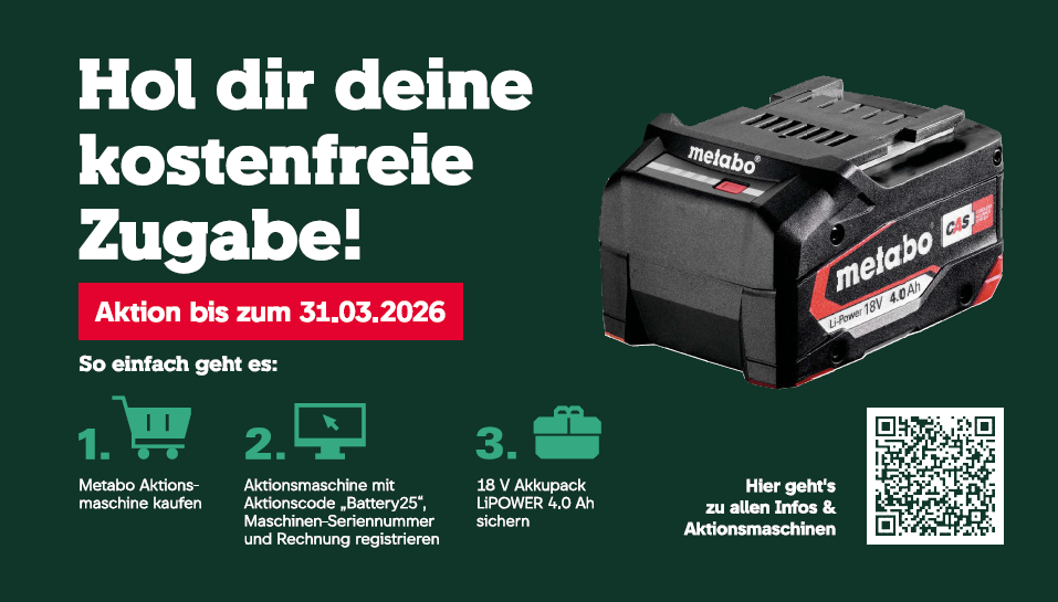 ![]() | Metabo Akku Aktion - GRATIS 18 V Akkupack LiPOWER 4.0 Ah Eines der teilnehmenden Metabo Akku-Elektrowerkzeuge kaufen, registrieren und einen gratis Akkupack LiPOWER 4.0 Ah sichern. Aktion läuft bis 31.03.2026. Weitere Informationen hier: https://www.metabo.com/de/de/aktionen/2025/gratis-aktion |