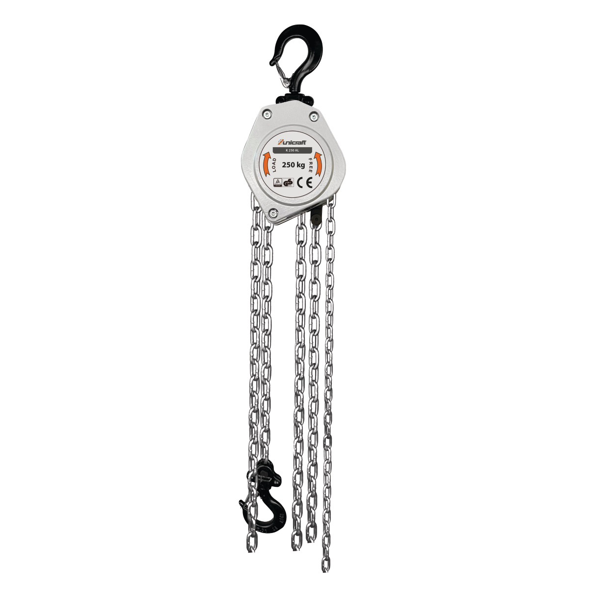 Geschlossenes Gehäuse aus hochfestem Aluminium, dadurch auch ein geringeres Gewicht Drehbarer Last und Aufhängehaken aus legiertem Stahl mit Sicherheitsverschluss Doppelte Sperrklinke für einen sicheren und zuverlässigen Betrieb Extrem feste Endverankerung der Kette dank speziellem Feinguss TÜV-GS geprüft