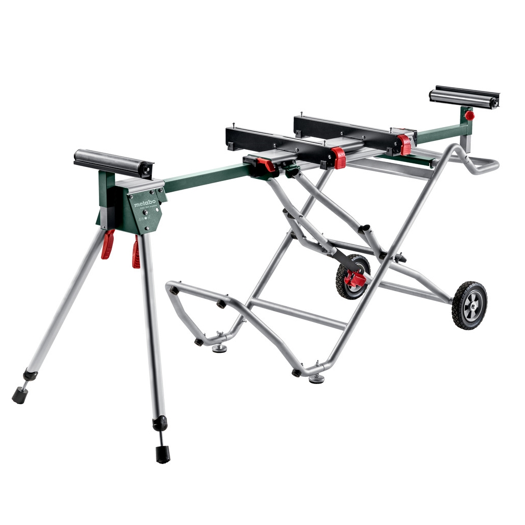 - Besonders robustes Kappsägen-Untergestell mit Trolleyfunktion für den mobilen Einsatz auch mit montierter Säge