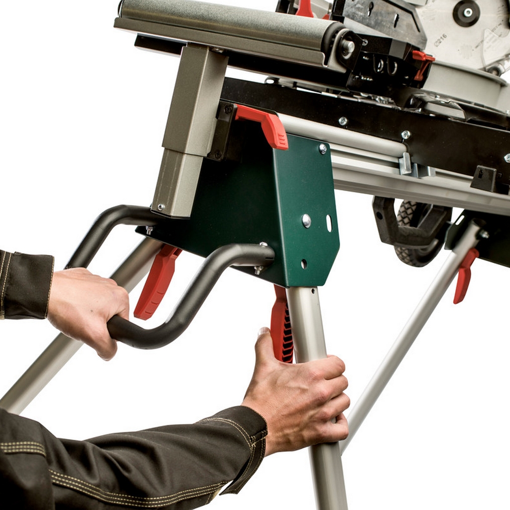 • Leichtes und robustes Kappsägen-Untergestell mit Trolley-Funktion für den mobilen Einsatz auch mit montierter Säge