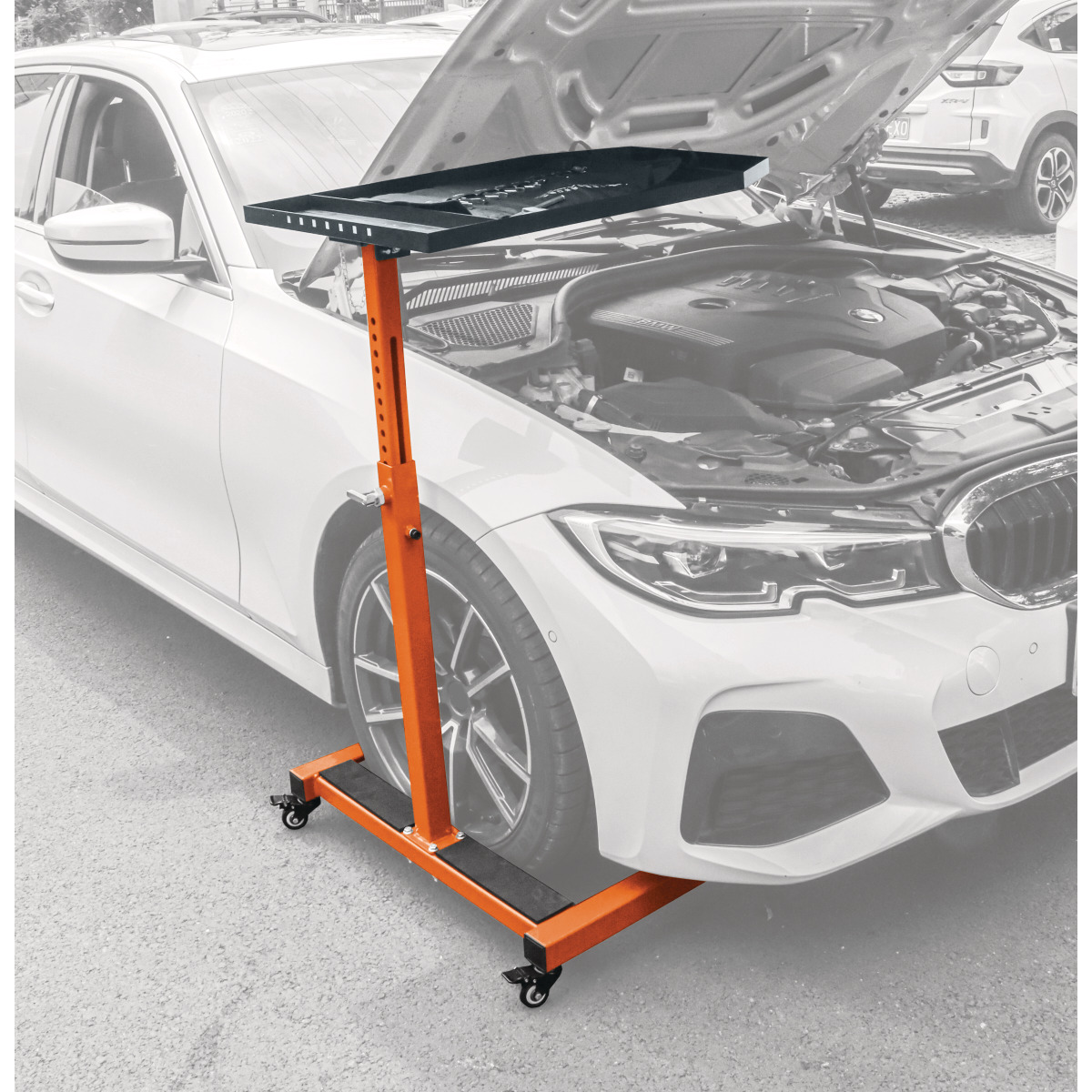 Rammschutz an allen wichtigen Berührungspunkten zum Schutz empfindlicher Stellen z.B. Karosserie und Felgen Perfekt zur Ablage von Werkzeug, Schrauben und Ersatzteilen bei der Reparatur Tisch um 90° nach unten klappbar Ablagetisch bis 35 kg belastbar 15-fach höhenverstellbar im 25 mm Lochraster Zwei Feststellbremsen an den Rollen sorgen für einen sicheren Stand Stabile Schweißkonstruktion In Verbindung mit dem im Zubehör erhältlichen Ablageboden perfekt für den Transport von z.B. Reifen und Ölfässern geeignet