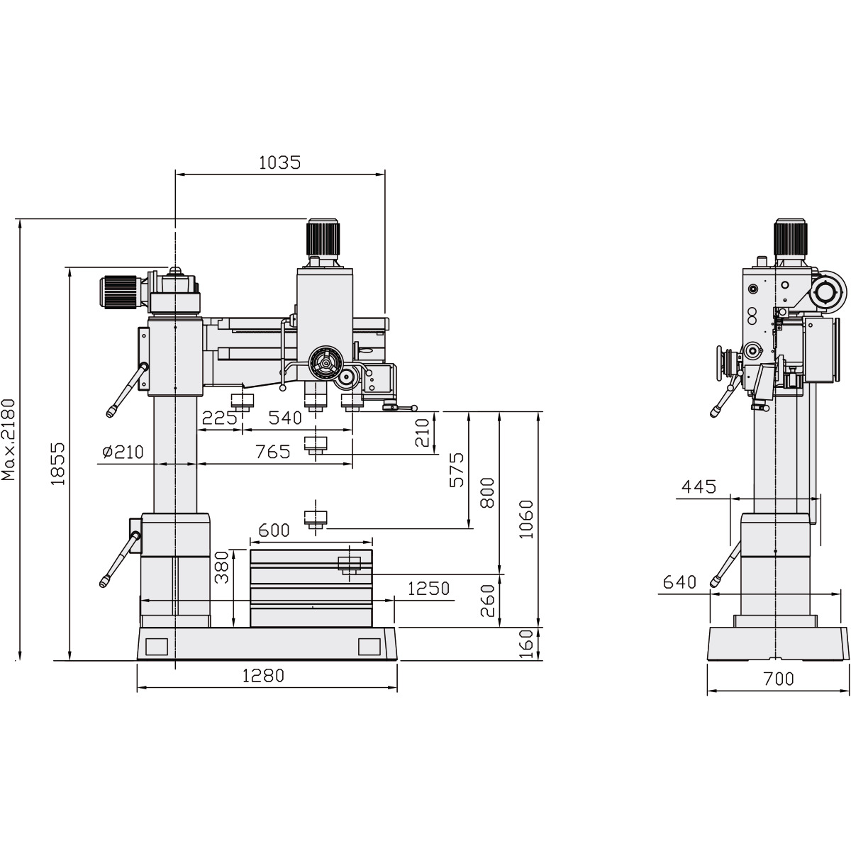 Abmessungen und Gewichte: Länge (Produkt) ca. 1260 mm Säulendurchmesser 210 mm Breite/Tiefe (Produkt) ca. 700 mm Höhe (Produkt) ca. 2180 mm Gewicht (Netto) ca. 1120 kg | Auslegerarm: Auslegerarm Drehwinkel 180 ° | Bohrleistung: Bohrleistung Stahl (S235JR) 32 mm Dauerbohrleistung Stahl (S235JR) 28 mm | Bohrtisch: Bohrtisch T-Nuten Größe 19 mm Bohrtisch T-Nuten Anzahl 3 Bohrtisch T-Nuten Abstand 171 mm Abstand Spindel - Bohrtisch max. 1060 mm Aufspanntisch Länge 600 mm Aufspanntisch Breite 445 mm Aufspanntisch Höhe 380 mm Aufspanntisch T-Nuten Größe 19 mm Aufspanntisch T-Nuten Anzahl 3 Aufspanntisch T-Nuten Abstand 100 mm Abstand Spindel - Aufspanntisch min. 0 mm Abstand Spindel - Aufspanntisch max. 675 mm Abstand Spindel - Bohrtisch min. 260 mm | Drehzahlbereich: Drehzahlbereich 73 - 1247 min¯¹ Anzahl der Drehzahlbereiche 6 | Elektrische Daten: Gesamt Anschlusswert 3 kW Anschlussspannung 400 V Netzfrequenz 50 Hz | Maschinenfuß: Maschinenfuß Arbeitsfläche Länge 828 mm Maschinenfuß Arbeitsfläche Breite 522 mm Maschinenfuß T-Nuten Größe 19 mm Maschinenfuß T-Nuten Anzahl 3 Maschinenfuß T-Nuten Abstand 100 mm Maschinenfuß Länge 1260 mm Maschinenfuß Breite 700 mm | Spindel: Pinolenhub 210 mm Spindelaufnahme MK 4 Geschwindigkeit Pinolenvorschub 0,05 – 0,15 mm/U Geschwindigkeitsstufen Pinolenvorschub 3 | Verfahrweg: Verfahrweg X-Achse manuell 530 mm Verfahrweg Z-Achse manuell 580 mm Abstand Spindel - Säule max. 750 mm Abstand Spindel - Säule min. 220 mm | Motor(en): Antriebsleistung Spindelmotor 1,5 kW Antriebsleistung Hubmotor Auslegerarm 0.75 kW Kühlmittelpumpe Leistung Antriebsmotor 90 W