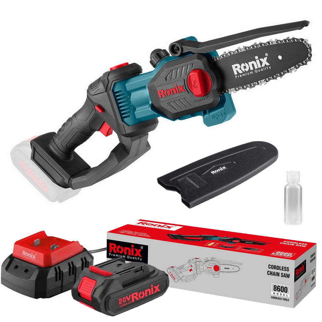 • Die Akku-Minikettensäge Ronix 8600 verfügt über einen hocheffizienten 20V-Motor, der die Laufzeit und Lebensdauer des Motors maximiert und eine Leerlaufdrehzahl von 3800 U/min liefert