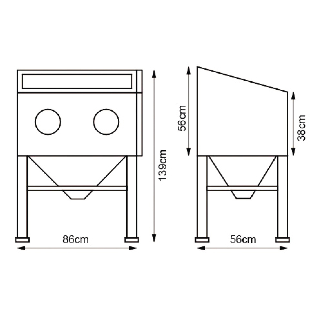 : Luftbedarf durchschnittlich, ca. 200 – 350 l/min Arbeitsdruck 2,8 – 8,0 bar Anschlussgewinde 3/8 " Strahlmittel Korngröße empfohlen 0.2 - 0.3 mm Strahlmittel Korngröße max. 0.125 - 0.45 mm Max. Gewicht auf dem Auflagegitter 80 kg Max. Gewicht Strahlgut 50 kg | Abmessungen und Gewichte: Länge (Produkt) ca. 950 mm Breite/Tiefe (Produkt) ca. 660 mm Höhe (Produkt) ca. 1380 mm Gewicht (Netto) ca. 48 kg Volumen Arbeitskabine 220 l Länge Kabine innen 840 mm Breite Kabine innen 550 mm Höhe Kabine innen 360 mm Handloch Durchmesser 175 mm | Seitentür (siehe zugehörige Zeichnung): Seitentür A 480 mm Seitentür B 558 mm Seitentür C 282 mm Seitentür D 592 mm