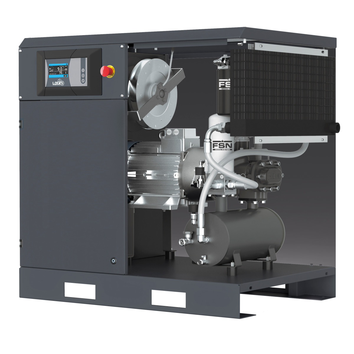 Innovative LOGIN-Steuerung mit 4,3" Touchscreen für einfache Bedienung und vollständige Kontrolle über alle Funktionen Verbindung von bis zu acht Kompressoren möglich, egal ob mit konstanter oder variabler Drehzahl Alle Informationen zum aktuellen Betriebsstatus auf einen Blick Drehrichtungskontrolle für den Motor, verhindert Schaden bei Inbetriebnahme oder nach einem Standortwechsel Niedrige Lärmemission (nur max. 67 dB) während des Betriebs, aufgrund äußerst niedriger Drehzahl des Schraubenverdichters und Verwendung eines geräuscharmen Radialventilators Optimale Betriebstemperatur und geringe Schwankung der Öltemperatur durch thermostatisch gesteuerten Radialventilator, optimale Kühlluftführung und großzügig bemessene Wärmetauscher Nachkühler verringert den Aufwand für Trocknung und Filtrierung der erzeugten Druckluft Serienmäßig mit Stern-Dreieck-Schaltung Servicefreundlich: einfacher Aus- und Einbau aller zu wartenden Komponenten