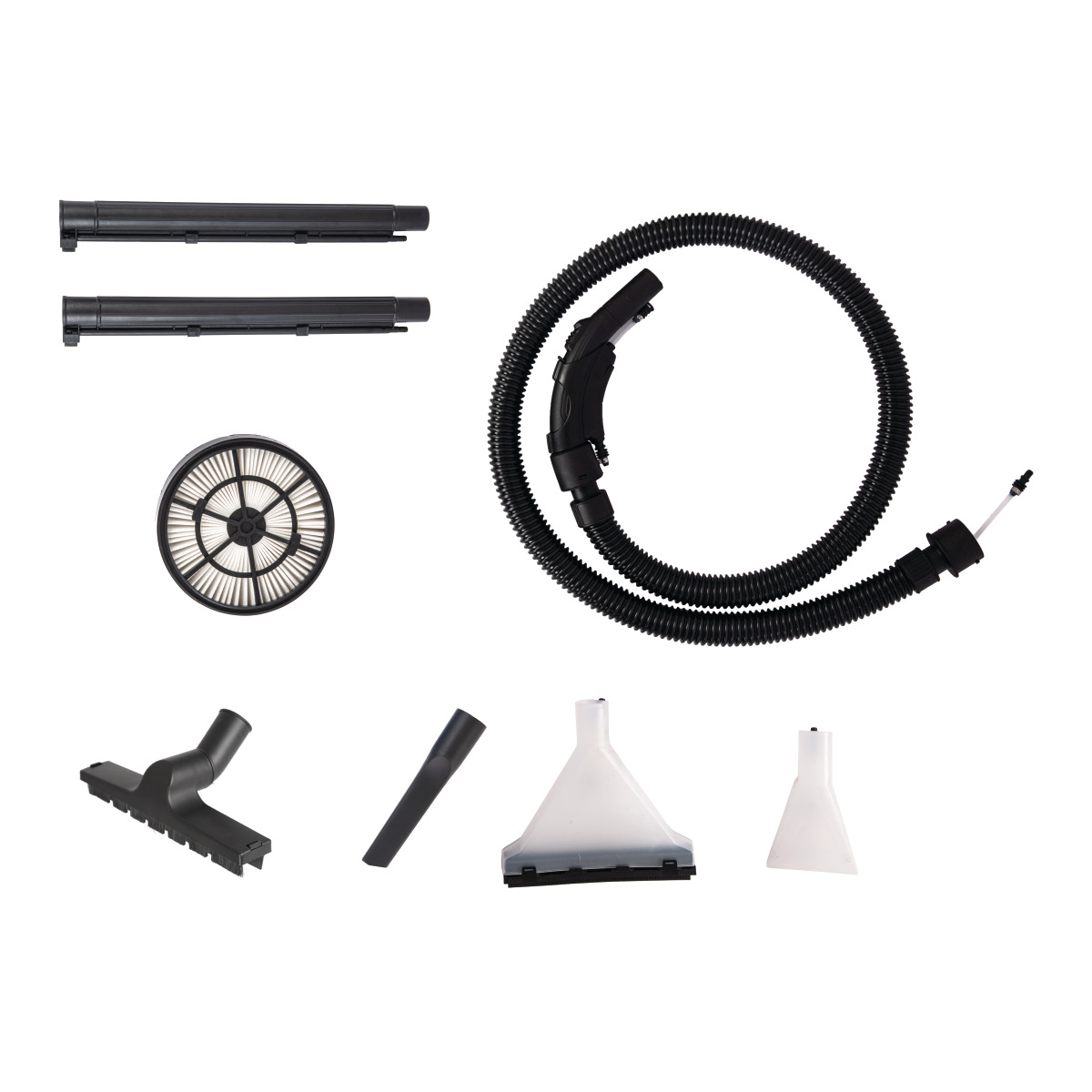 Teppich- und Bodenreinigungsdüse für Teppiche und glatte Böden Polsterreinigungsdüse für Möbel- und Automobilpolster Reinigungsmitteltank aus Polyethylen und Schmutzwassertank aus Edelstahl Elastischer und flexibler Saugschlauch widersteht hoher Belastung und jeglicher Art von Verdrehung Inklusive Blasfunktion und halbautomatischer Filterabreinigung
