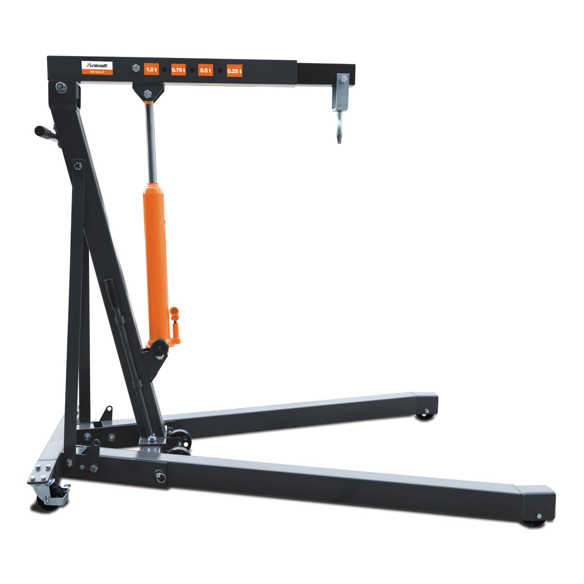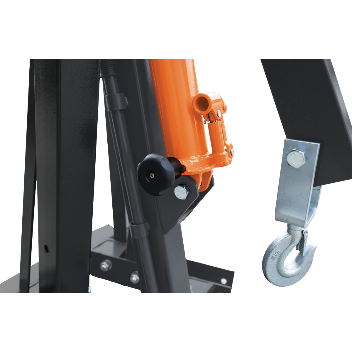 Kranausleger vierfach verstellbar, Traglast je nach Ausladung Geringe Unterfahrhöhe dank versenkter Lastrollen Zwei Lenkrollen aus Stahl mit Feststellbremse für maximale Flexibilität und für sicheren Stand Sicherheitshaken am Auslegerarm Platzsparende Aufbewahrung durch klappbare Fußrohre Schnell auf- und abbaubar