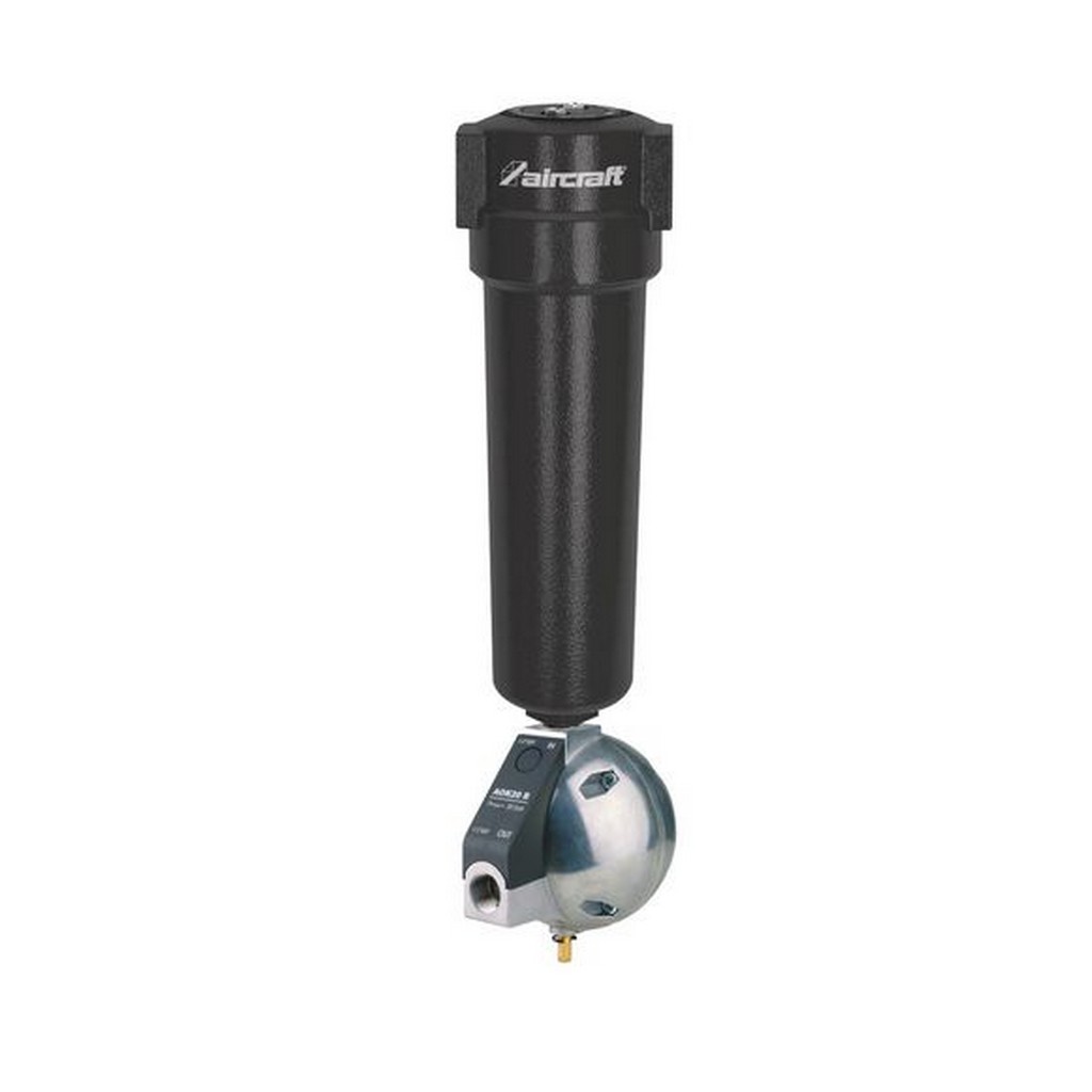 Zur hocheffizienten Abscheidung großer Kondensatmengen aus Druckluft- und Vakuumsystemen Einbau zwischen Kompressor und Druckluftbehälter Filtergehäuse aus Aluminium und innen eloxiert Abscheidung von Kondensat (Wasser, Öl) und Schmutzpartikeln durch zentrifugale Beschleunigung der Druckluft Über den serienmäßigen Kondensatableiter mit Schwimmerventil wird das Kondensat aus dem Wasserabscheider abgeschieden Elektronischer Kondensatableiter nachrüstbar